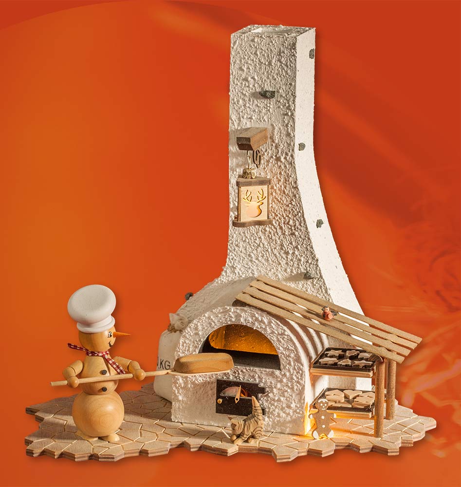 'Oh es riecht gut, oh es riecht fein ...!' Das unsere Schneemänner, die 'Feschen Kerlchen', nicht nur schlemmen können beweist dieses Bild. Sie sind durchaus sehr fleißig. Wie in diesem Fall werden leckere Pfefferkuchen und Stollen gebacken. Diese schmecken auch unserem rasenden Reporter Klaus Knolle. Räucherbackofen, indirekt beleuchtet, kann mit echten Räucherkerzen betrieben werden, passend zur Themenwelt 'Weihnachtsbäckerei'